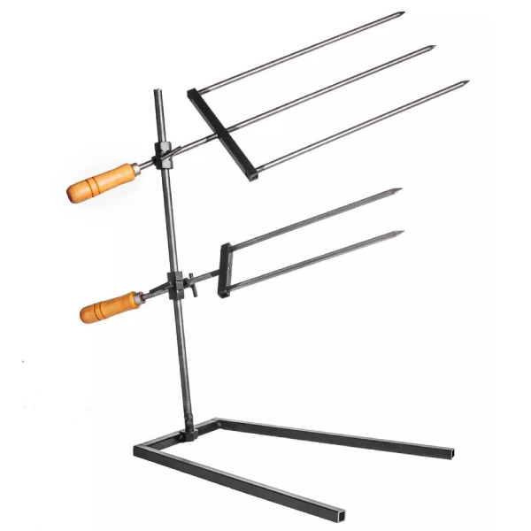 Espeto Tridente desenvolvido especialmente para o assado parrilla e fogo de chão, com possibilidade de assar dos dois lados. O espeto também possui encaixe nos dois lados possibilitando o giro do assado.